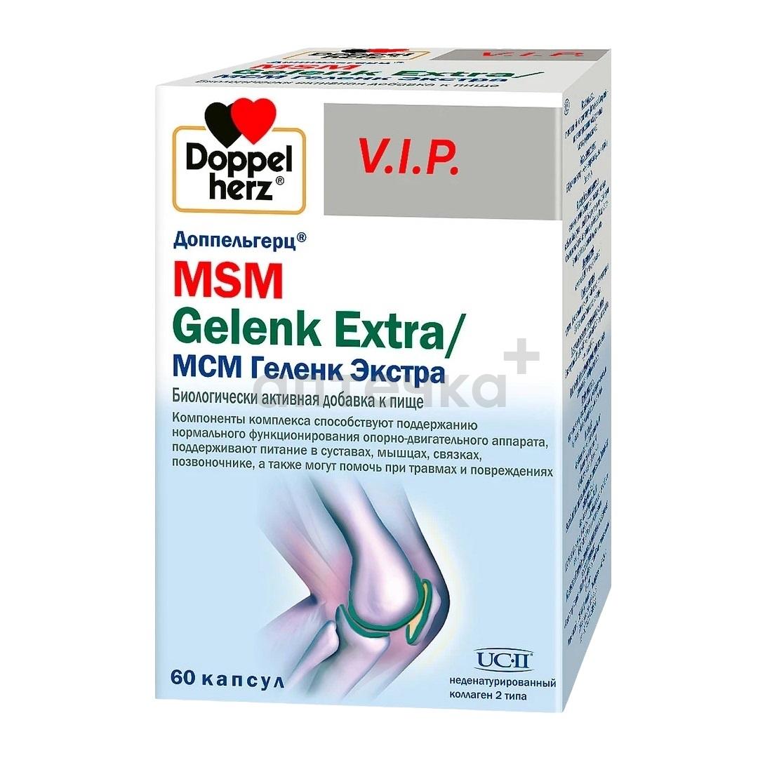 Доппельгерц МСМ Геленк Экстра рекомендуется в качестве биологически активной добавки к пище - источника глюкозамина, хондроитинсульфата, дополнительный источник витамина С, марганца, содержащей метилсульфонилметан. Компоненты комплекса способствуют поддержанию нормального функционирования опорно-двигательного аппарата, поддерживают питание в суставах, мышцах, связках, позвоночнике, а также могут помочь при травмах и повреждениях.