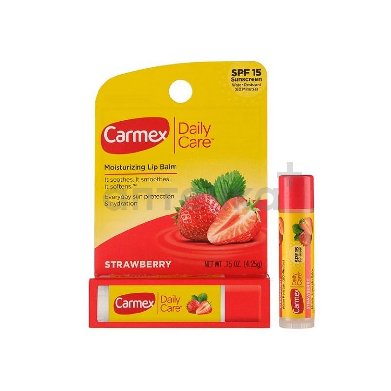 Ароматизированный бальзам для губ Carmex SPF 15 со вкусом клубники помогает ухаживать за сухими и потрескавшимися губами, эффективно восстанавливает и защищает нежную кожу губ от воздействия солнца, ветра или мороза.